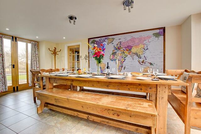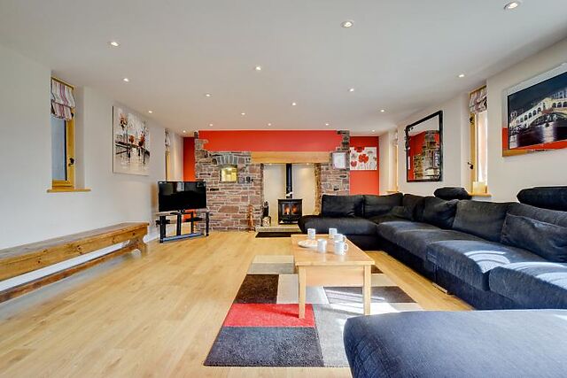 The ground floor boasts two lounges, one with a vast 12-seater sofa in front of a cosy wood burner and TV, and a smaller reading room with comfy sofas and its own TV. The fully equipped kitchen features a large cooker, eight-ring hob, and a dining table seating 12. A utility room and a ground-floor shower room with a WC add to the convenience.