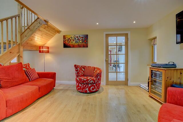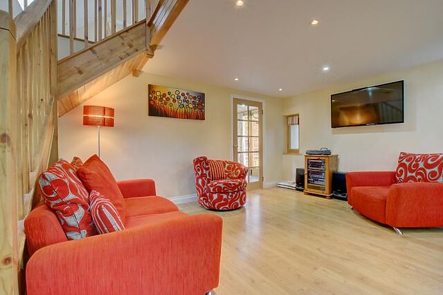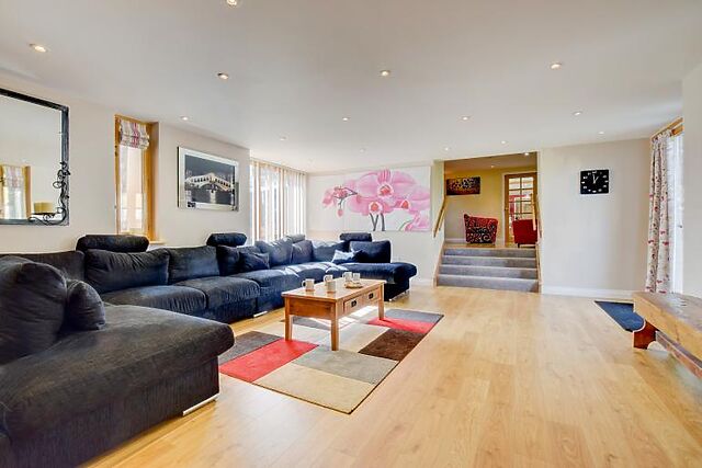 The ground floor boasts two lounges, one with a vast 12-seater sofa in front of a cosy wood burner and TV, and a smaller reading room with comfy sofas and its own TV.