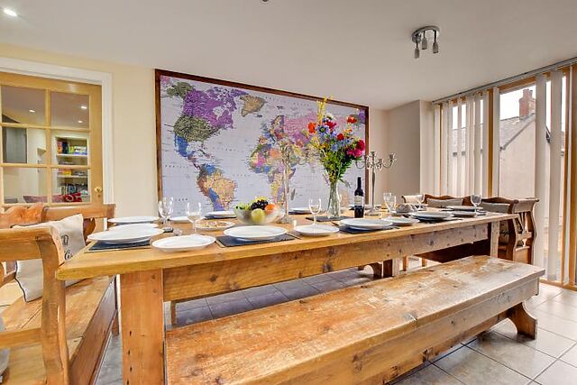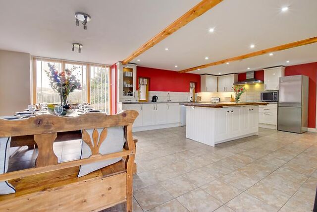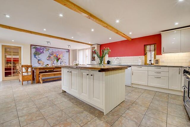 The fully equipped kitchen features a large cooker, eight-ring hob, and a dining table seating 12. A utility room and a ground-floor shower room with a WC add to the convenience.