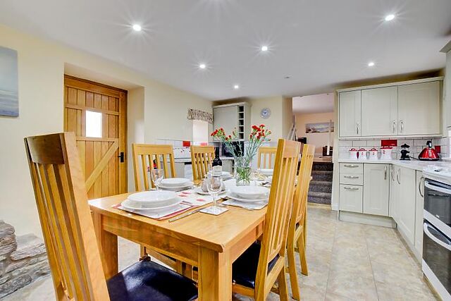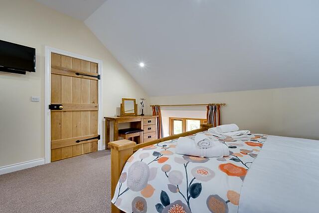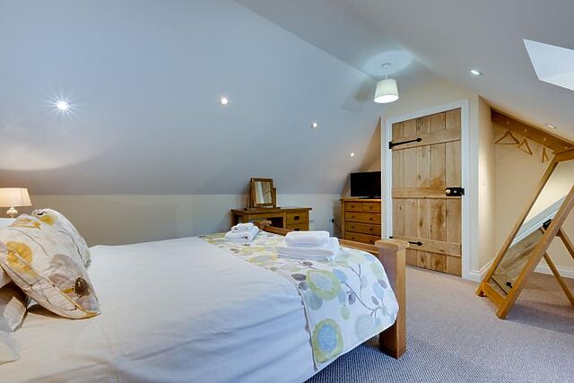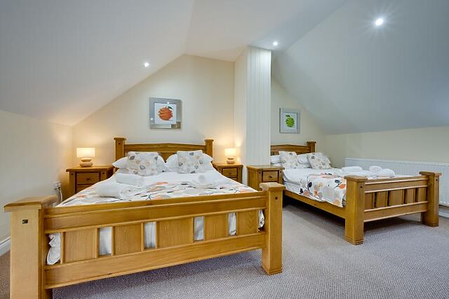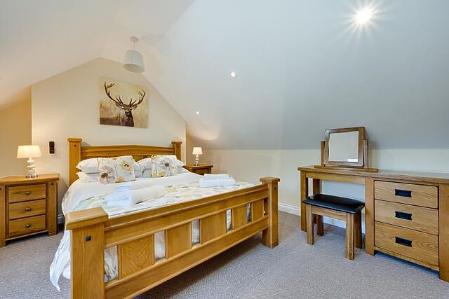 Inside, you'll find a spacious lounge with comfortable sofas and armchairs arranged around a wood burner, perfect for relaxing evenings. The fully equipped kitchen includes a dining table with seating for six, making it ideal for family meals. The bedrooms are tastefully decorated with high-quality wooden furniture, providing a restful atmosphere.
