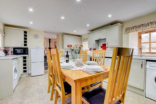 Inside, you'll find a spacious lounge with comfortable sofas and armchairs arranged around a wood burner, perfect for relaxing evenings.