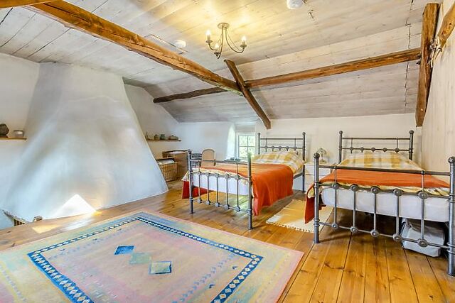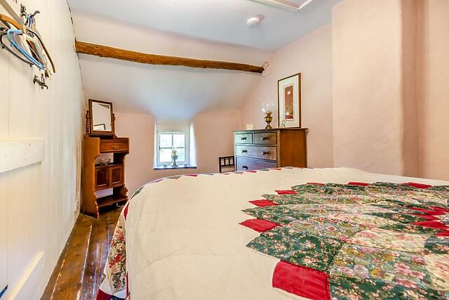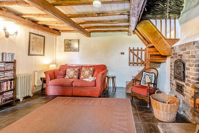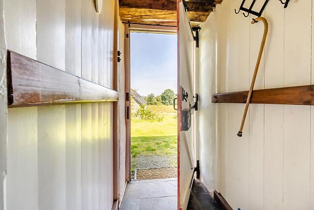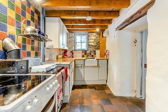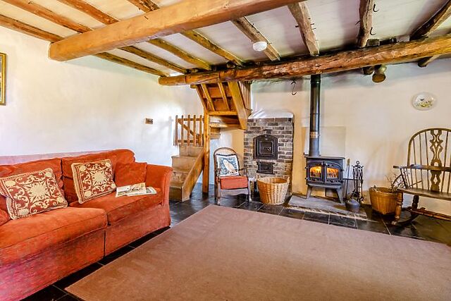 The cottage's interior boasts original features like exposed wooden beams, a willow chimney, and rustic slate floors. The fully equipped kitchen and period furnishings ensure a comfortable stay.