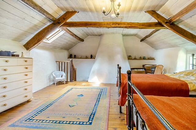 The narrow, winding staircase leads to a cosy first floor with a unique bedroom layout and a thoughtfully designed bathroom.