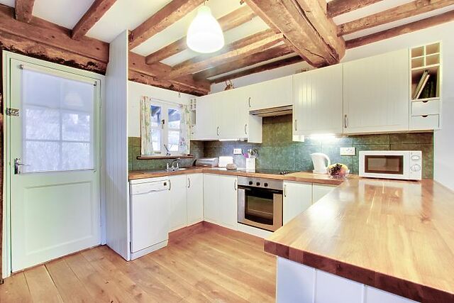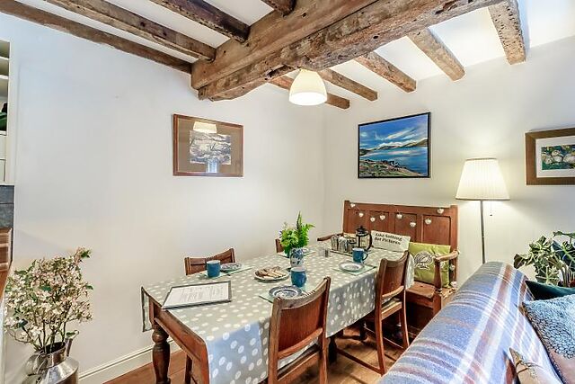 Step inside and you'll find traditional features like exposed beams and antique furnishings, perfectly complemented by modern amenities. The open-plan living space includes a practical kitchen and dining area, while the wood burner adds a touch of warmth and comfort.