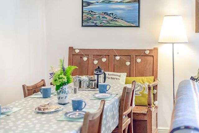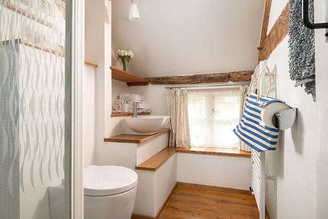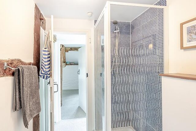Upstairs, the accommodation includes a characterful double room with countryside views and a charming twin room. The contemporary shower room features a walk-in shower, ensuring a comfortable stay for all guests.