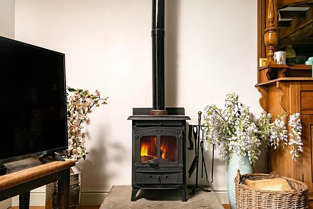 The open-plan living space includes a practical kitchen and dining area, while the wood burner adds a touch of warmth and comfort.