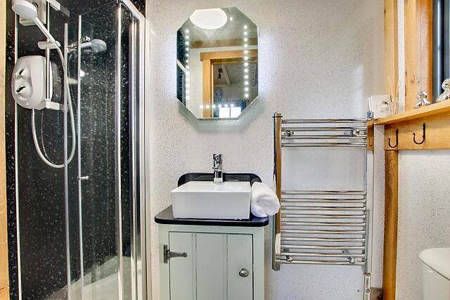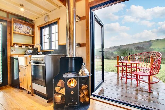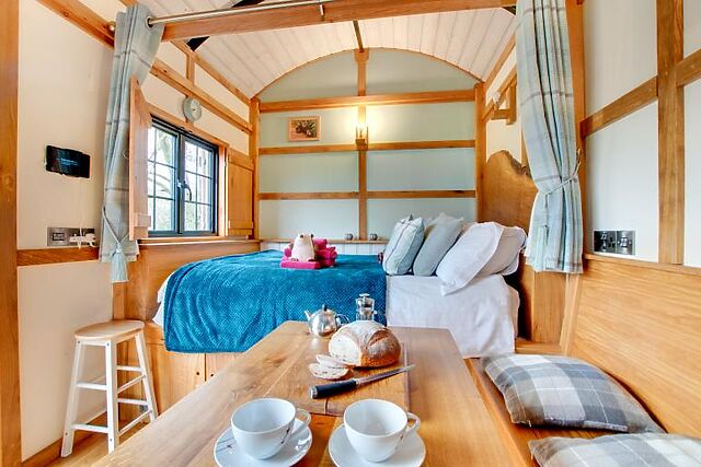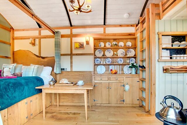 The open-plan layout features a cosy double bed with a rustic wooden headboard, a snug wood burner, and a simple yet sufficient kitchen. The modern bathroom includes a full-size shower unit, basin, and WC.