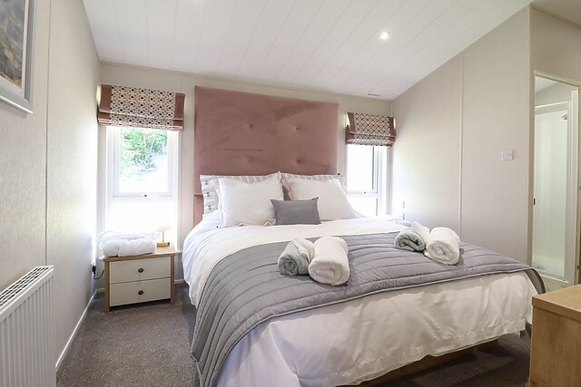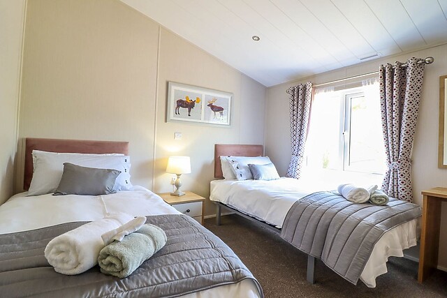 The king-size bedroom boasts an en-suite with a walk-in shower, heated towel rail, basin, and WC, offering a private space to prepare for the day. The twin bedroom is equally as welcoming, providing a flexible sleeping arrangement for all party types.