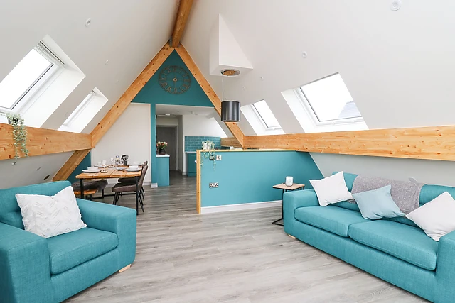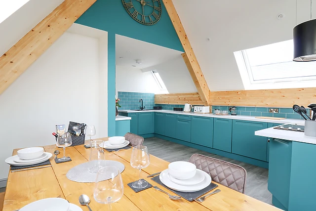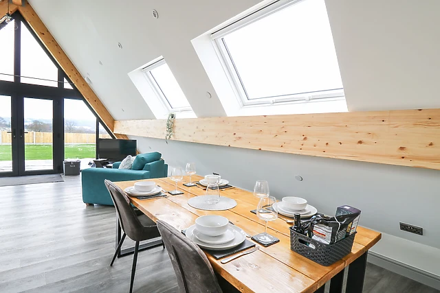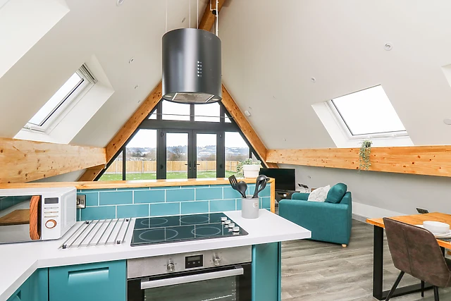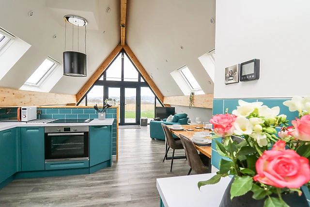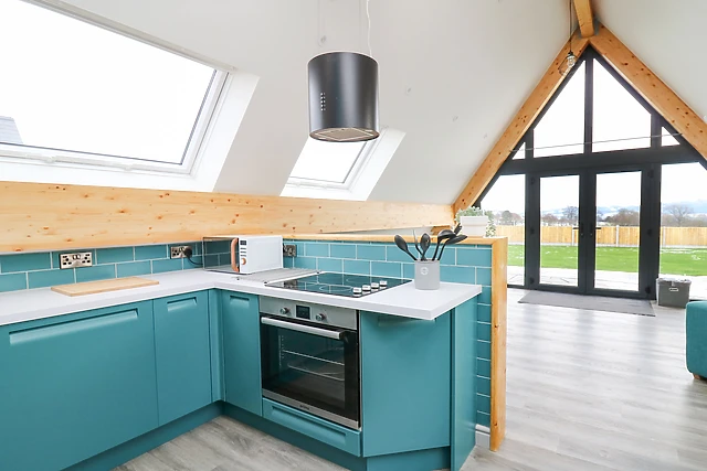 The open-plan living space, complete with a fully-equipped kitchen, dining area, and sitting area, is warmed by electric underfloor heating, ensuring a cosy atmosphere throughout your stay.