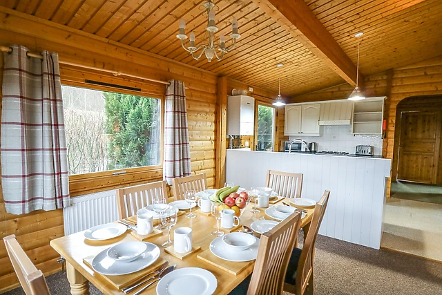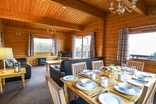 The lodge offers a stylish open-plan living space where you can unwind and enjoy panoramic rural views.