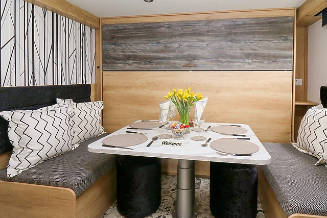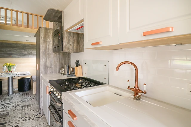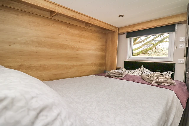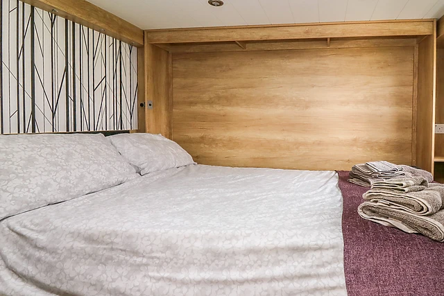 The accommodation boasts a quirky mezzanine double bedroom accessible via a ladder, a pull-out double bed in the dining area, and a double sofa bed in the living space.