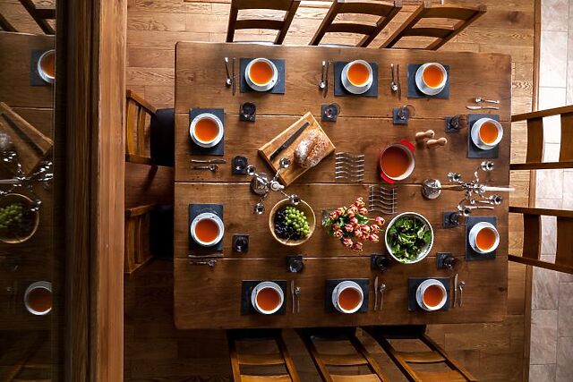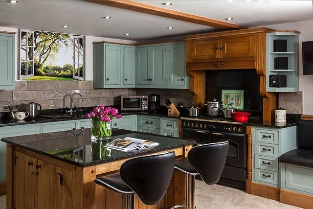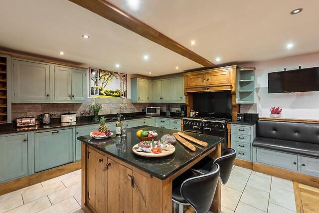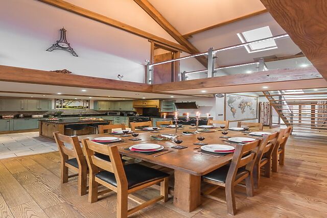 The kitchen/diner is well-equipped to cater for large groups, featuring ample preparation space, a breakfast bar, and a solid oak dining table with 12 seats.