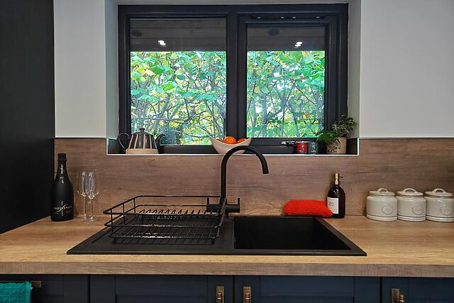 Park in your private parking spot (there’s room for two cars) and head towards your stylish holiday cabin. Inside, you’ll be greeted by an inviting open-plan lounge/kitchen/dining area that instantly draws your eye to the stunning river views that are framed by the impressive floor-to-ceiling patio doors.