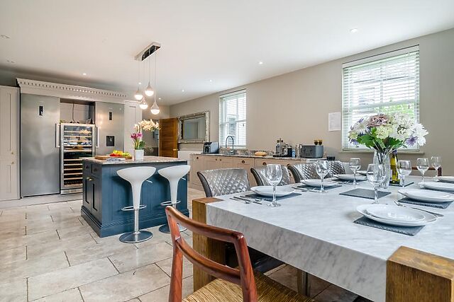 By the French doors, the dining table invites celebratory meals and the chance to raise a glass. Adding convenience to the downstairs, discover a utility room with additional storage and a washing machine.