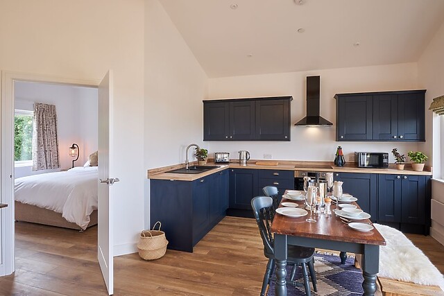 Come together for an evening to eat at the dining table, which is positioned nicely between the kitchen and living room areas. Accessed from this communal space are both double bedrooms, equally boasting high-quality bed linen, bespoke chest of drawers and decorative pieces as well as the shared bathroom with marble effect walk-in shower.