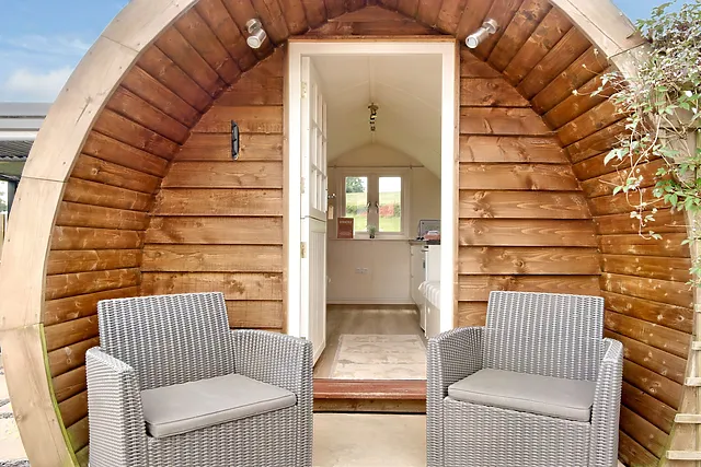 The hut is beautifully handcrafted, featuring a comfortable double bed, a wood burner for snug evenings, and the added luxury of underfloor heating for the cooler months. The separate kitchen hut is equipped with a gas stove, microwave, and fridge, ensuring you have everything you need for a self-catered stay.
