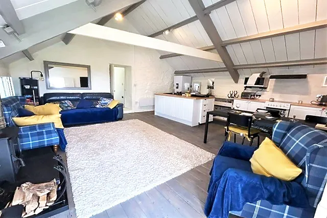 The elevated first-floor living space offers stunning sea views, complemented by a wood burner for cosy evenings.