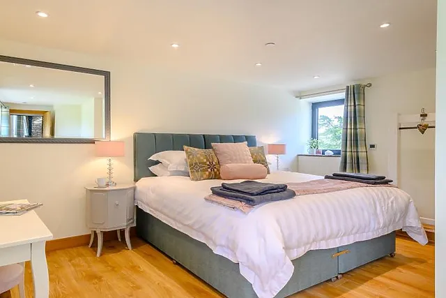The super-king-size and double room share a ’Jack and Jill’ shower room. On the first-floor mezzanine level is a king-size bedroom with an en-suite bathroom.