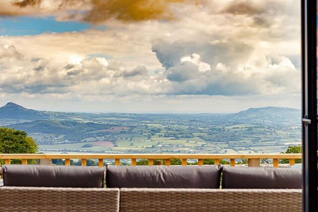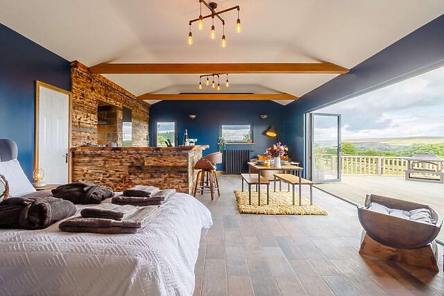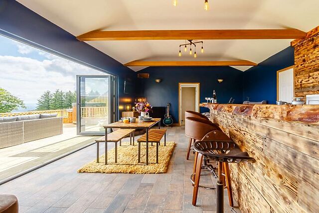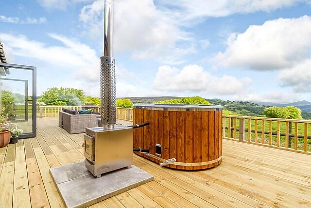 The open-plan space features bi-folding doors that open onto a terrace, offering stunning views of the Sugar Loaf, Skirrid, and Blorenge peaks. A highlight is the wood-fired jacuzzi hot tub, perfect for soaking under the dark skies.