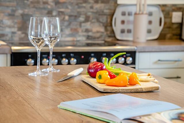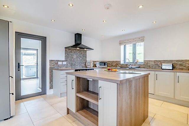 Log burner. Large fully equipped kitchen including island unit, full sized fridge freezer, 5 ring electric hob and double oven, dishwasher, microwave, washing machine, toaster, kettle and breakfast bar.