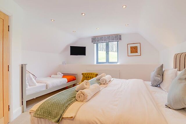 Upstairs Bedroom 2 - King size bed and one single bed, stylish vanity station, TV and radio. En-suite - Shower unit, WC, basin and towel rail.