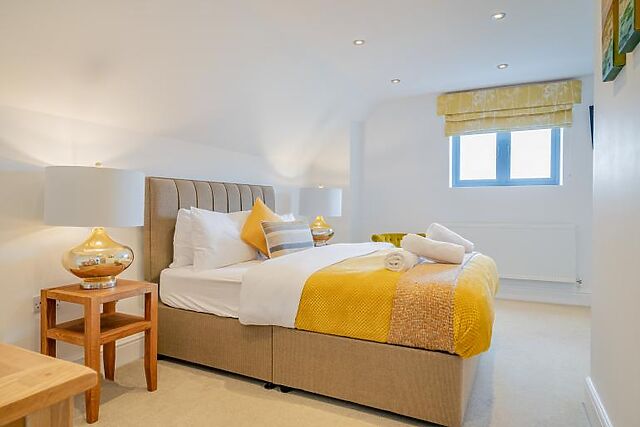 Bedroom 3 - Superking bed with vanity unit, TV and radio. En-suite - Bath with shower over bath, WC, basin and towel rail.
