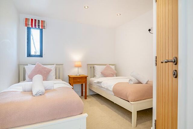 Bedroom 1 - 2 single beds, chest of drawers and a wall mounted TV. En-suite with shower unit, WC and basin.