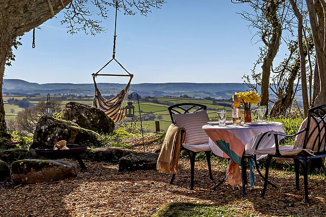 Guests can enjoy a variety of outdoor amenities including a hammock, fire pit, BBQ, and outdoor furniture, all set within a private bluebell woodland with direct access to fields for walks and picnics.