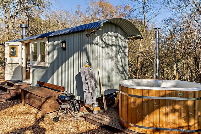 The hut is equipped with a kitchen area featuring a gas hob and woodburning stove-style oven, ensuring all your culinary needs are met. Outside, a hammock, fire pit, and BBQ await to enhance your al fresco dining experience amidst the stunning countryside vistas.
