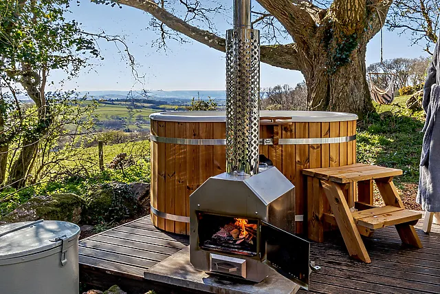 Yes, the accommodation features a private wood-fired hot tub, offering guests a serene spot to relax and soak in the stunning views of the surrounding countryside.