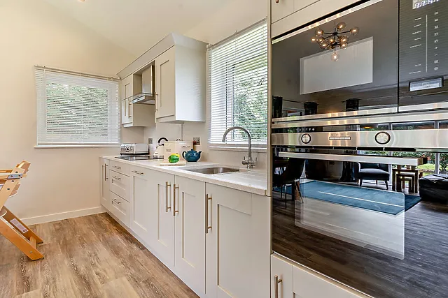 The lodge features a downstairs bedroom and bathroom for added convenience. The open-plan living area, complete with a Smart TV and a fully equipped kitchen, opens onto a sunny patio area.