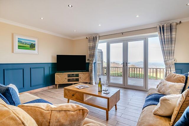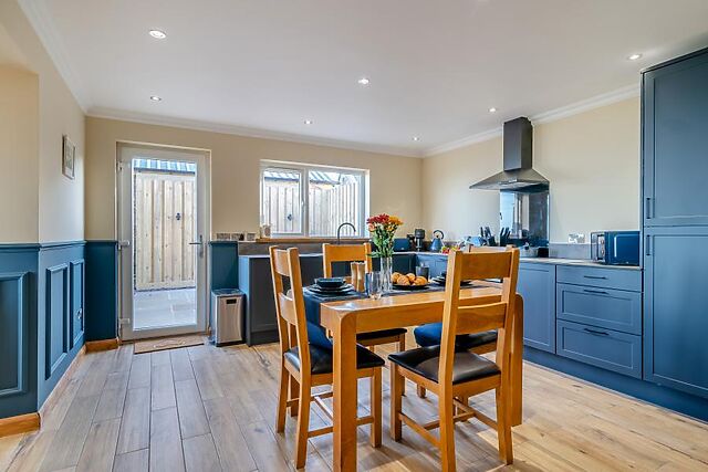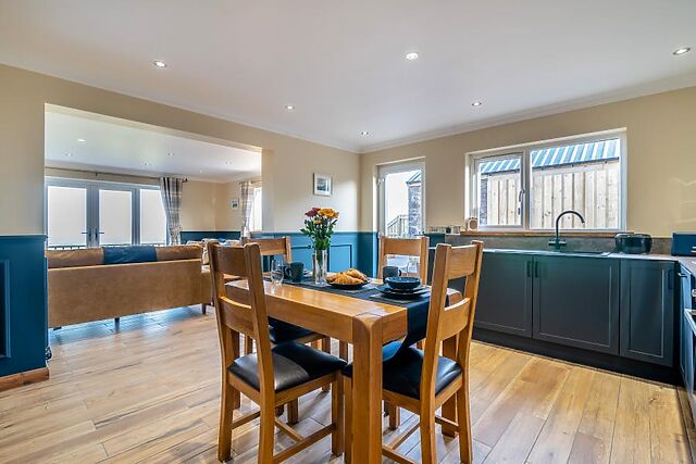 Inside, the open-plan living area includes a generously sized lounge area furnished with comfortable sofas. Snuggle up and enjoy the views, or draw the curtains and stream a movie on the Smart TV.